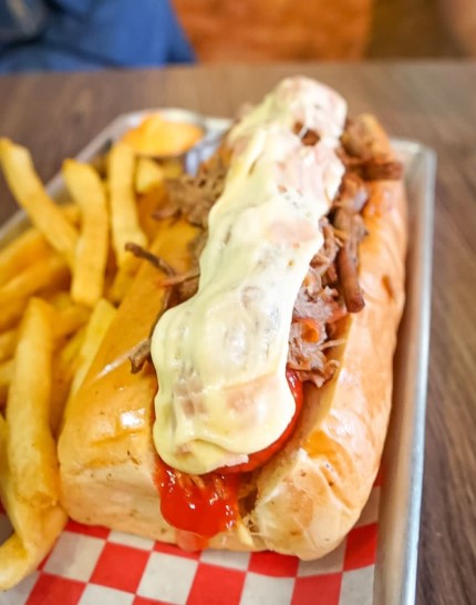 Bondiola de cerdo ahumada al barril mechada, tocineta, cama de papas, queso rayado, bañadas en salsa bbq y cheddar