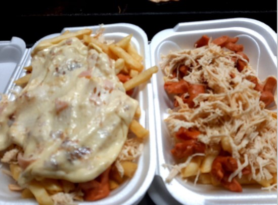 Papa francesa, lomito de pollo, salchicha, queso gratinado.