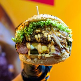 1 Hamburguesa doble carne de res 120 cada una, doble queso, con tocineta, chorizo caramelizado en la parte superior acompañada de papas a la francesa ( 70 gramos)