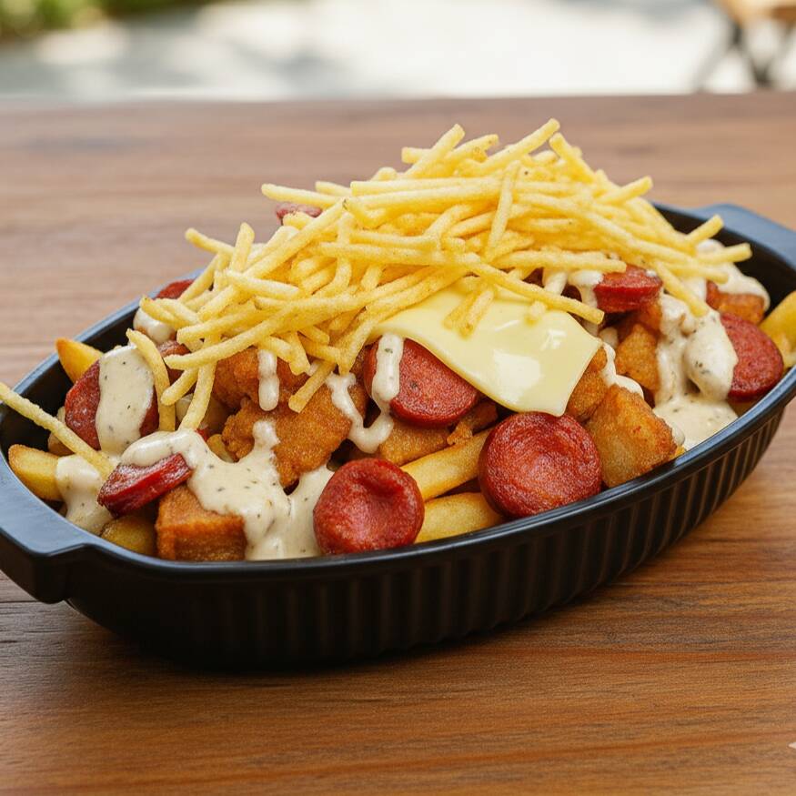 Papa crocante, bocados de lomo de cerdo a la parilla, chicharron carnudo en tiras, chorizo caramelizado, queso tajado, papa fosforito y salsas