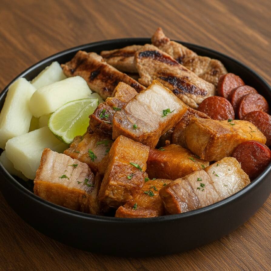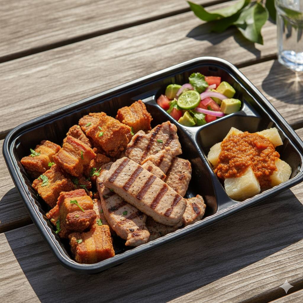 Chicharron carnudo crocante, costillita de cerdo al horno, chorizo de cerdo en moneditas, lomo de cerdo a la parrila, maduro en medallones, yuca al vapor y vegetales