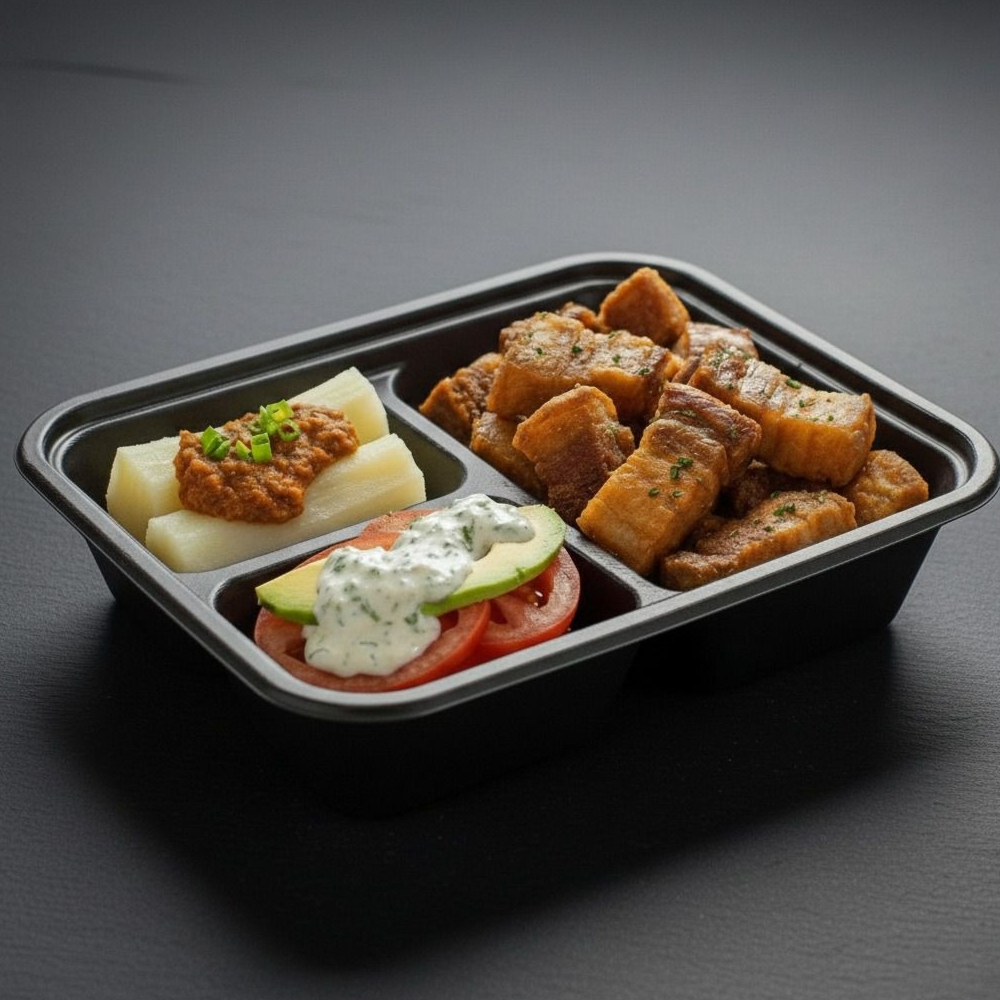 350 gr de crocante chicharrón carnudo acompañado de yuca al vapor y vegetales
