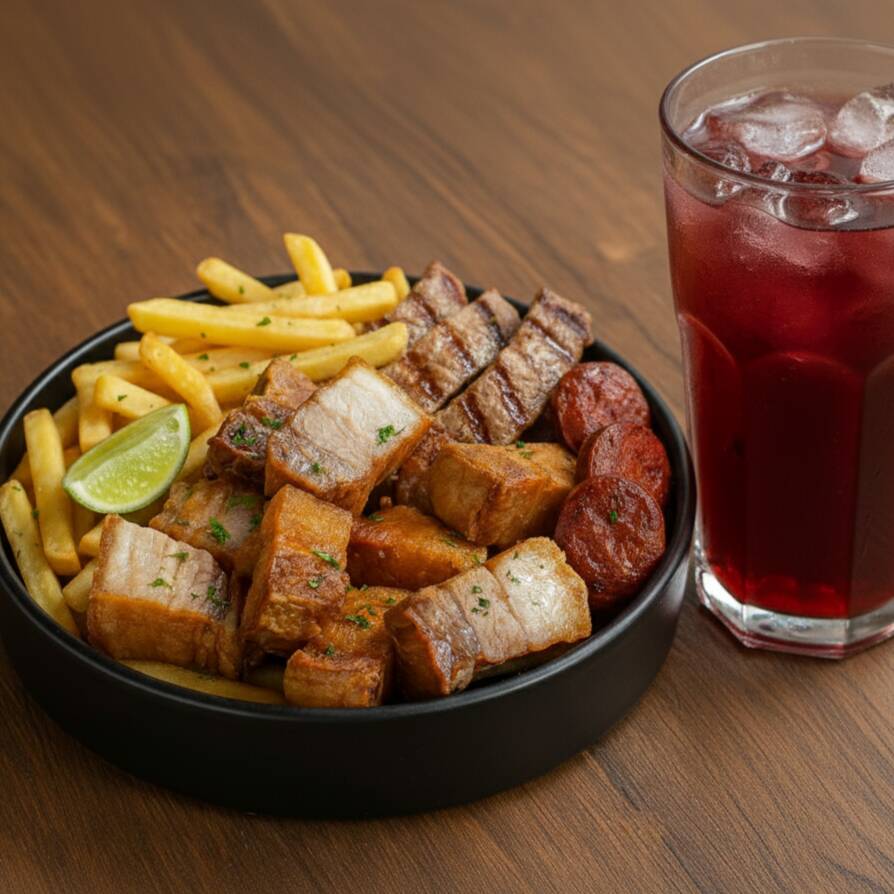 Tazón personal con chicharrón premium, lomito a la parrilla, chorizo ahumado + papa francesa + té helado y salsas.