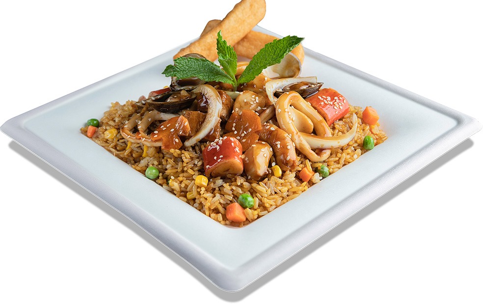 Arroz frito al wok con anillos de calamar, mejillones, calamar, camarón, ostras, pulpo, palmitos de cangrejo, pescado, cebolla en julianas y tamaño a elegir.