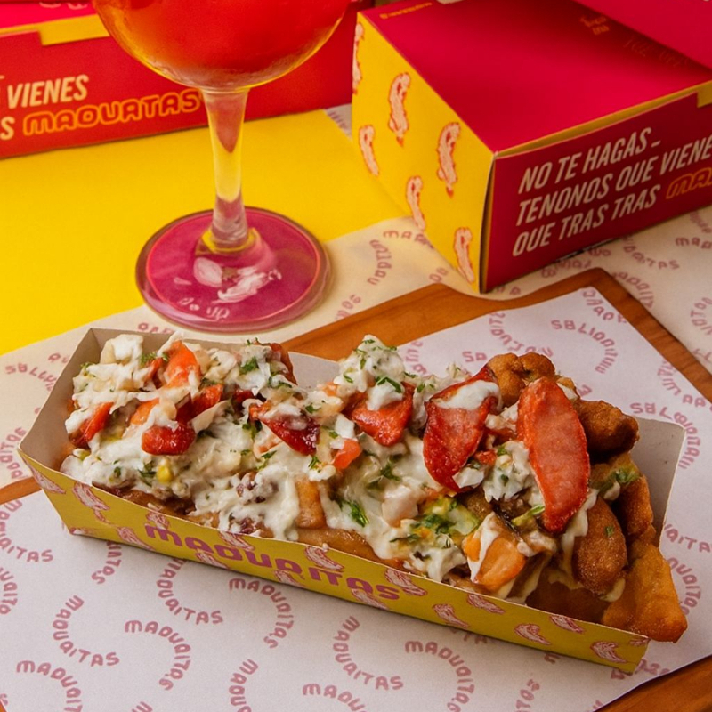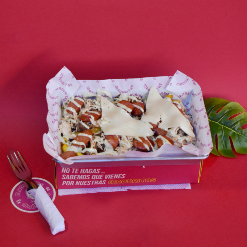 Papas a la francesa, salchicha, chorizo, maduro, pulled pork y queso.