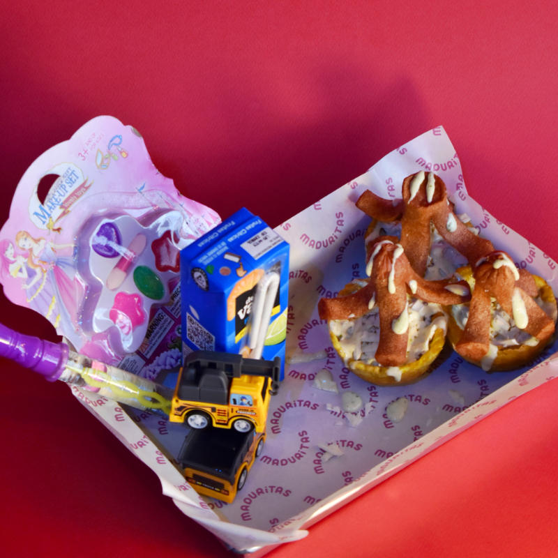 3 Canastas de plátano maduro, salchicha en pulpos, queso rallado, acompañado de jugo de cajita y juguete del mes.