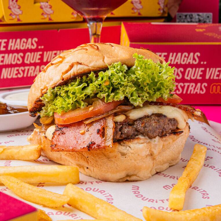 Pan brioche, carne de res (140 g), tocineta, queso doble crema, madurito, suero, chorizo caramelizado y vegetales frescos.