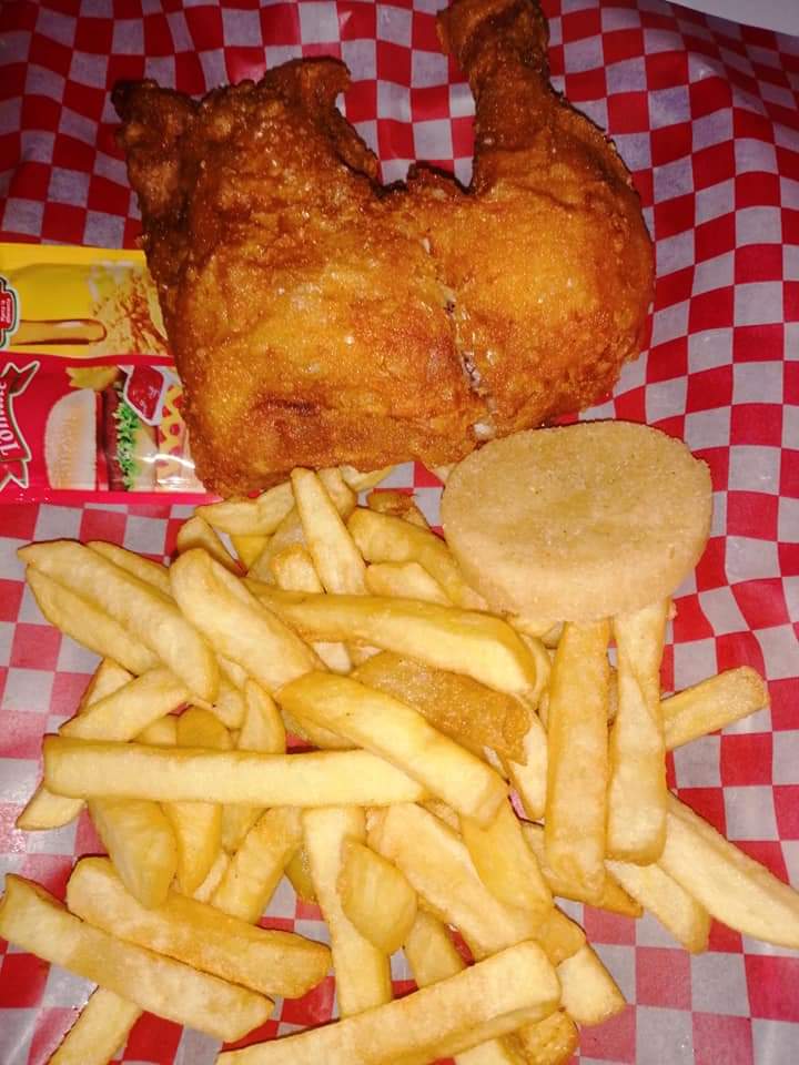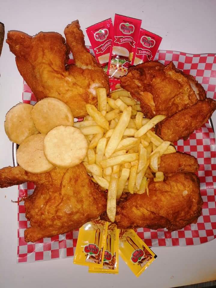 Un pollo entero a la broaster, acompañado de papa a la francesa, arepitas, una porción de sopa y ají.