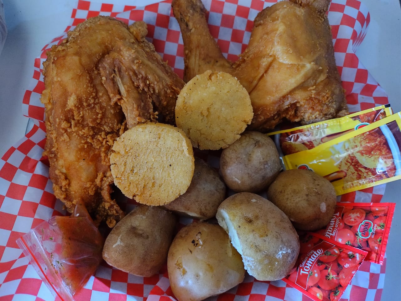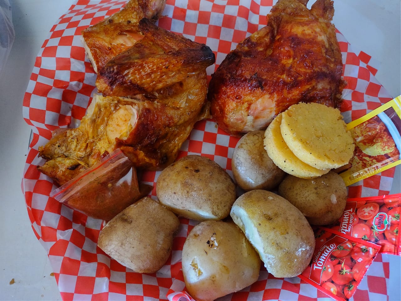 Un pollo entero mixto (mitad asado y mitas broaster), acompañado de papa al vapor, arepitas, una porción de sopa y ají.