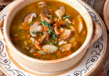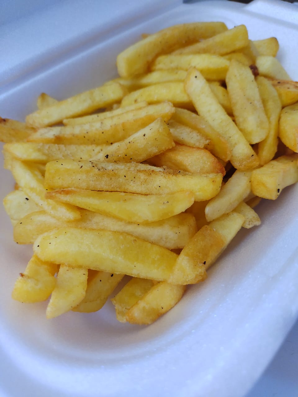 Medio pollo a la broaster, acompañado de papa a la francesa, arepitas, una porción de sopa y ají.