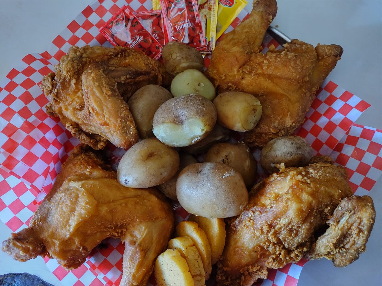 Un pollo entero mixto (mitad asado y mitad broaster), acompañado de papa al francesa, arepitas, una porción de sopa y ají.
