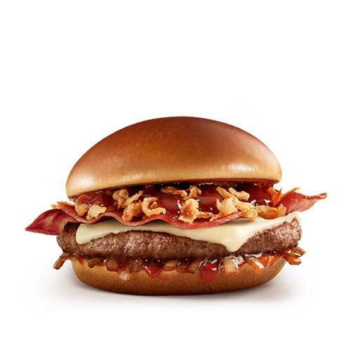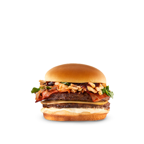 Hamburguesa con una carne de res de 125gr c/u y salsa barbecue, tocineta, cebolla crispy y grillada 100% colombiana y queso cheddar.