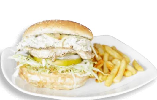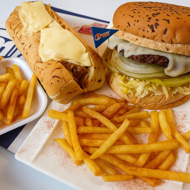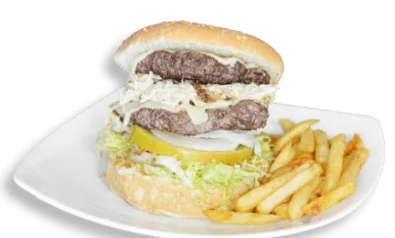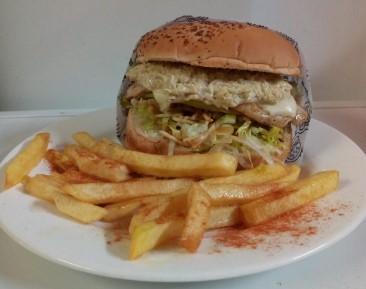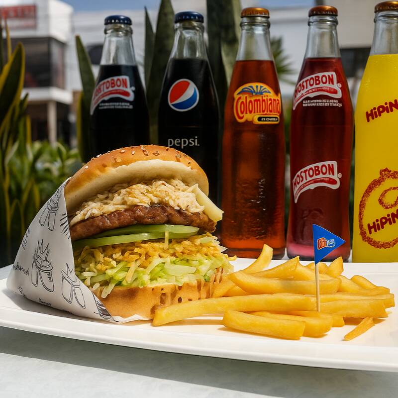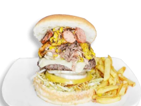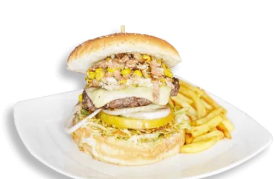 Doble Carne de 126 gr, Pollo Desmechado, Queso Doble Crema, Verduras, Papitas Molidas, Salsa Tártara, Piña y Papa Francesa.