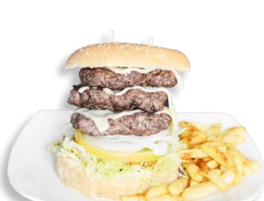 3 Carnes, queso, lechuga, tomate, cebolla, papita molida, tártara, piña y papa francesa.
