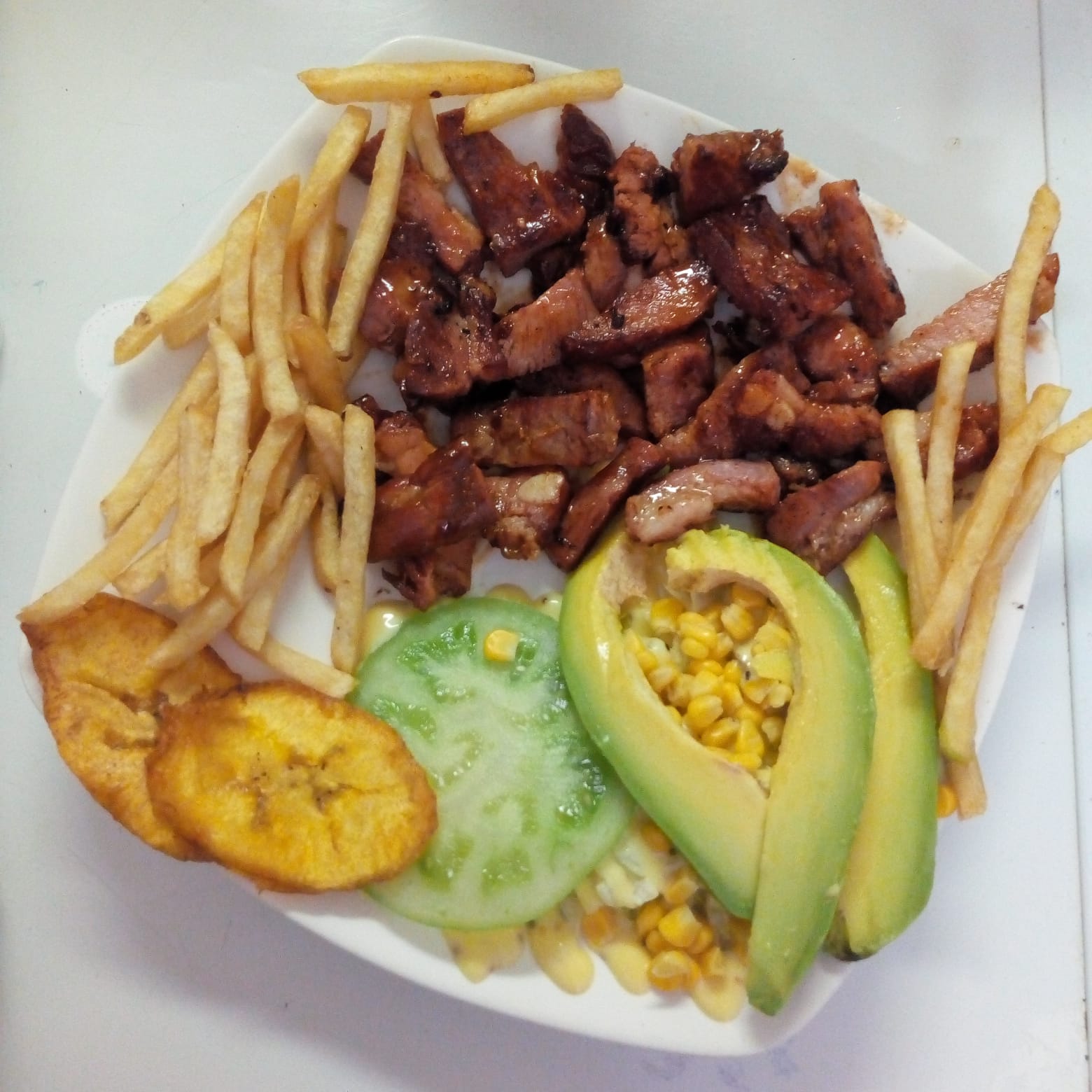 Costillas de Cerdo, Lomos de Cerdo, Carne, Pechuga, Sobre Barriga, Rodajas de Plátano y Papas a la Francesa