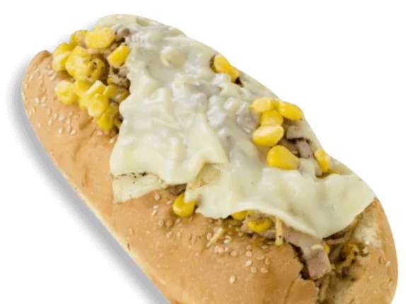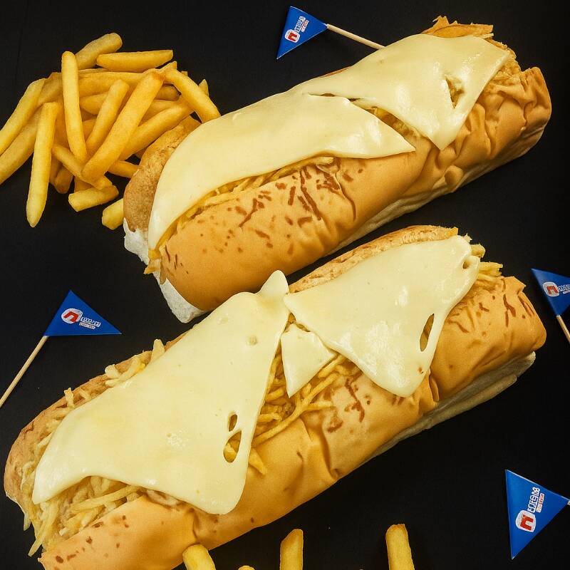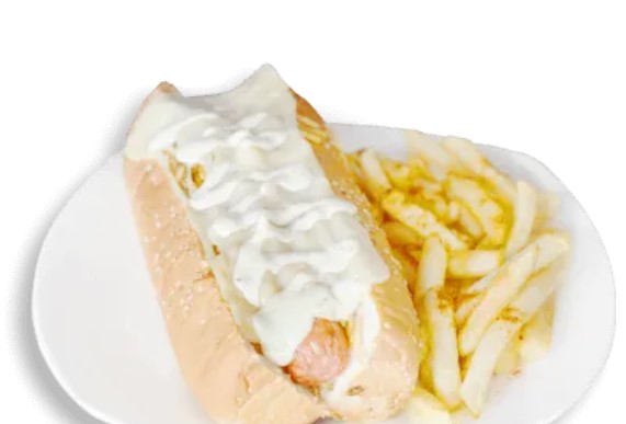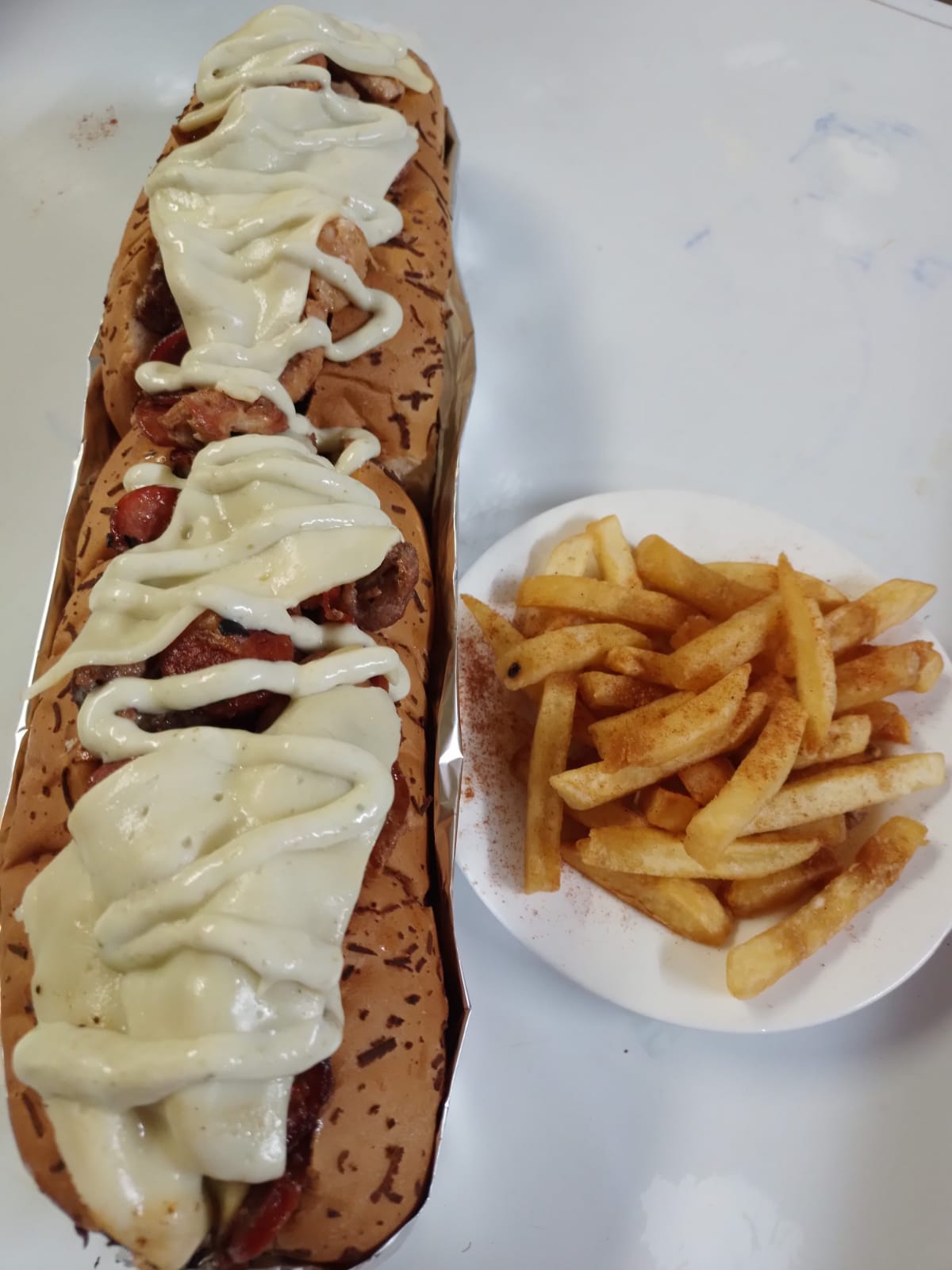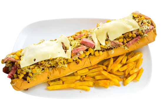 Salchicha americana de 30 cm, Trozos de Carne, Pechuga, Chorizo, Queso, Tartara, Piña y Papa Francesa
