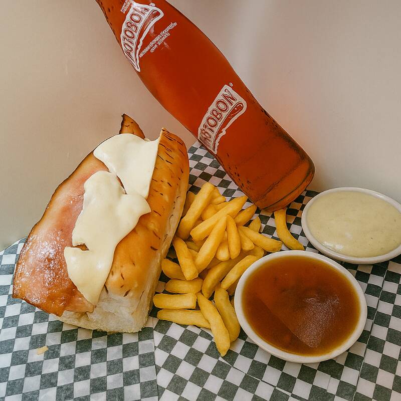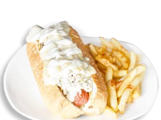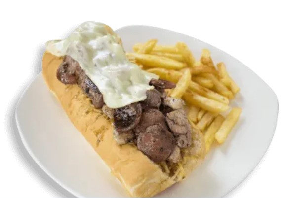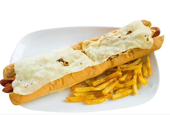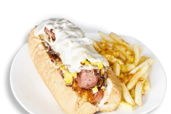 Pan de Perro Relleno de Carne de Lomo, Chorizo, Pechuga, Queso Gratinado y Papa a la Francesa