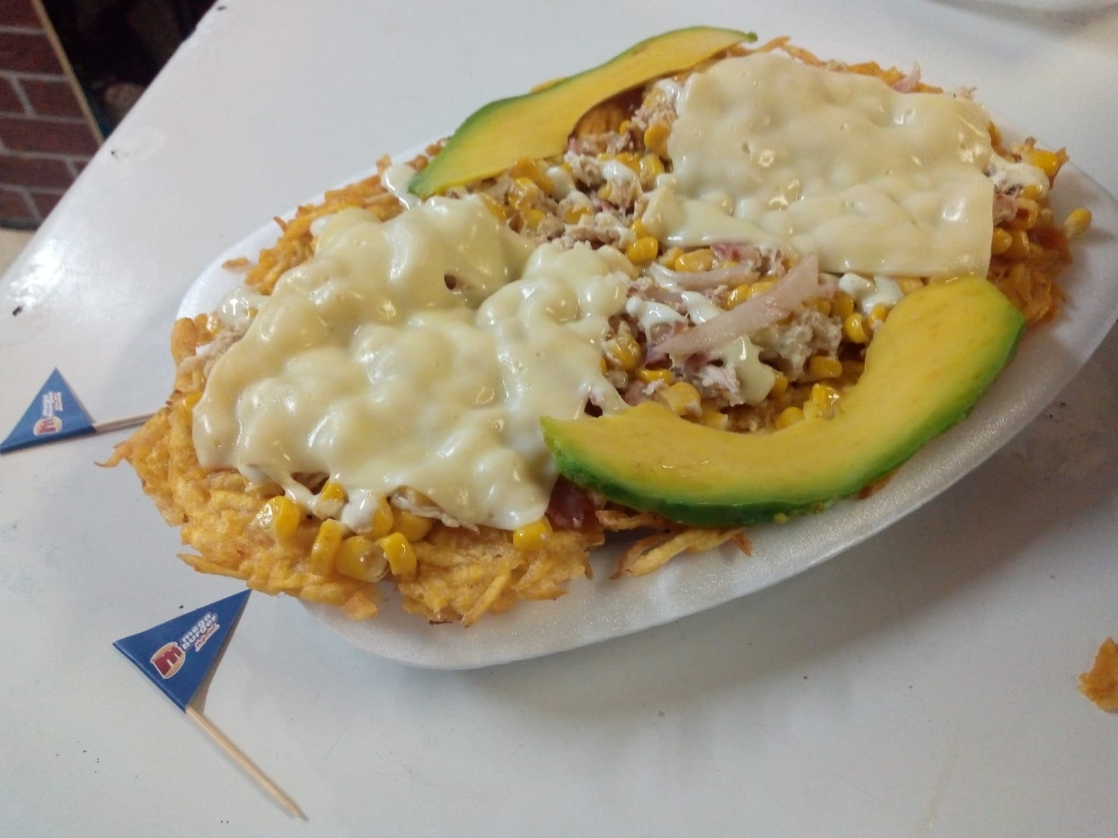Salchicha, carne desmechada, maíz, tocineta, papita molida, tártara, piña, queso y papa francesa.