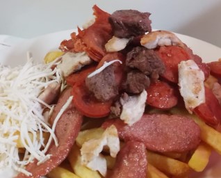 Salchicha, papa, trozos de carne, chorizo y pechuga, Queso semi salado. + Salsas (Tártara y Piña)