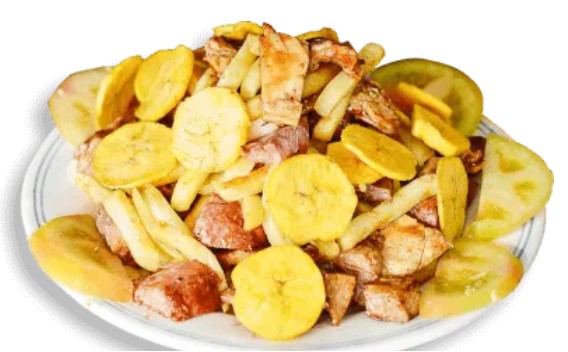 Carne, trozos de salchicha, chorizo, carne desmechada, maíz, maduro, queso, lechuga, tomate, cebolla, papita molida, tártara, piña y papa francesa.