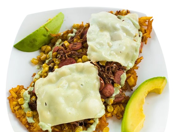 Salchicha, Chorizo, Carne Desmechada, Maíz, Maduro Picado y Queso.