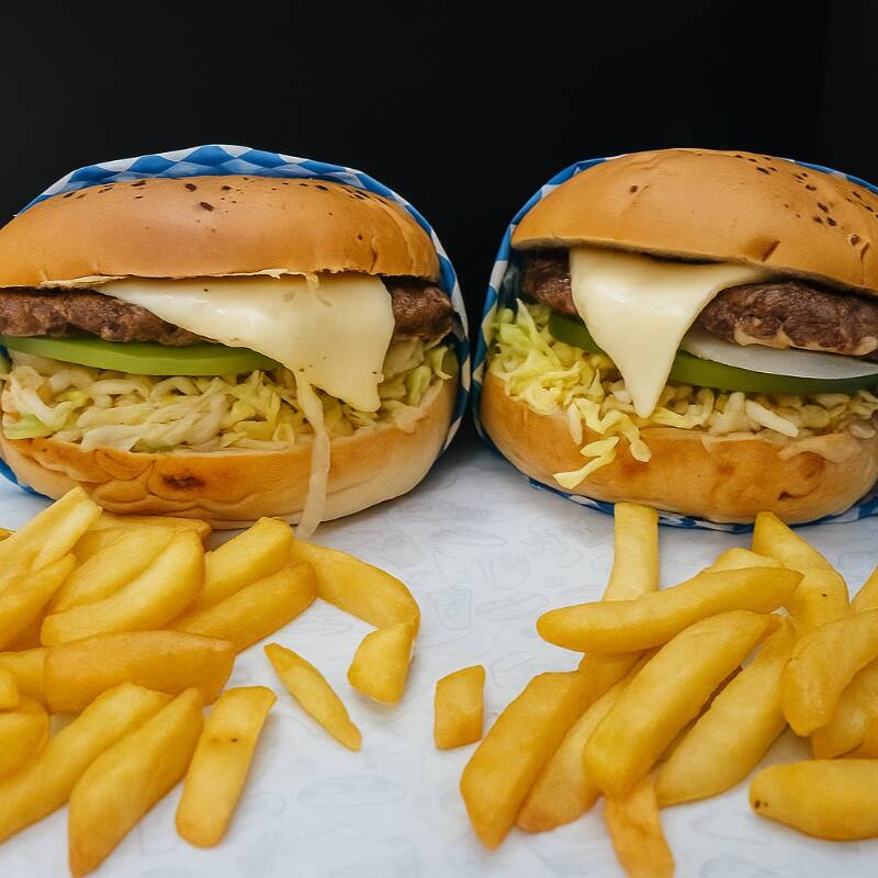 2 HAMBURGUESAS MEGA SENCILLAS, carne, queso, lechuga, tomate, cebolla, papitas molida, tartara, piña y papa francesa.