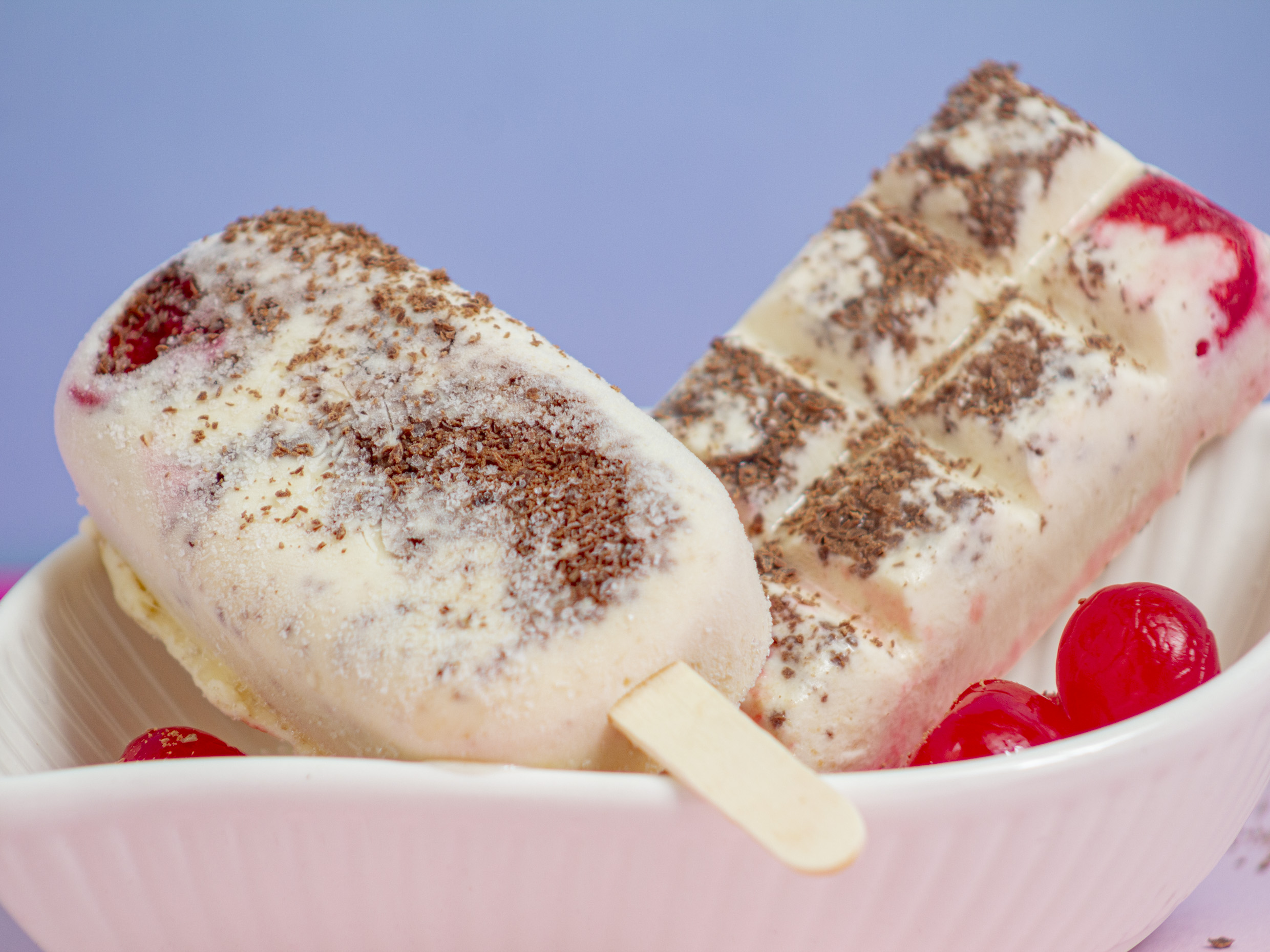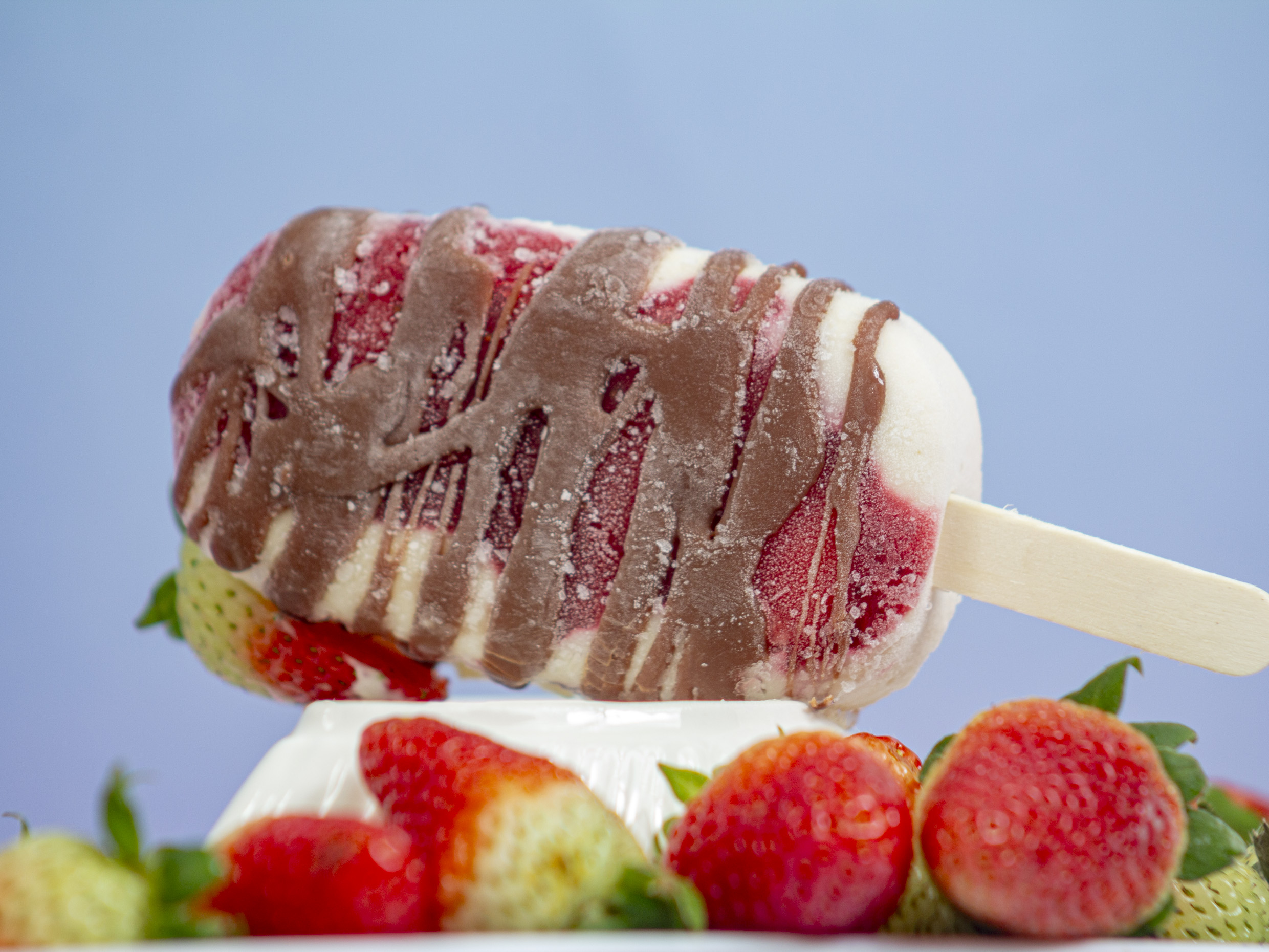 Paleta de fresas con crema con veteado de chocolate negro.