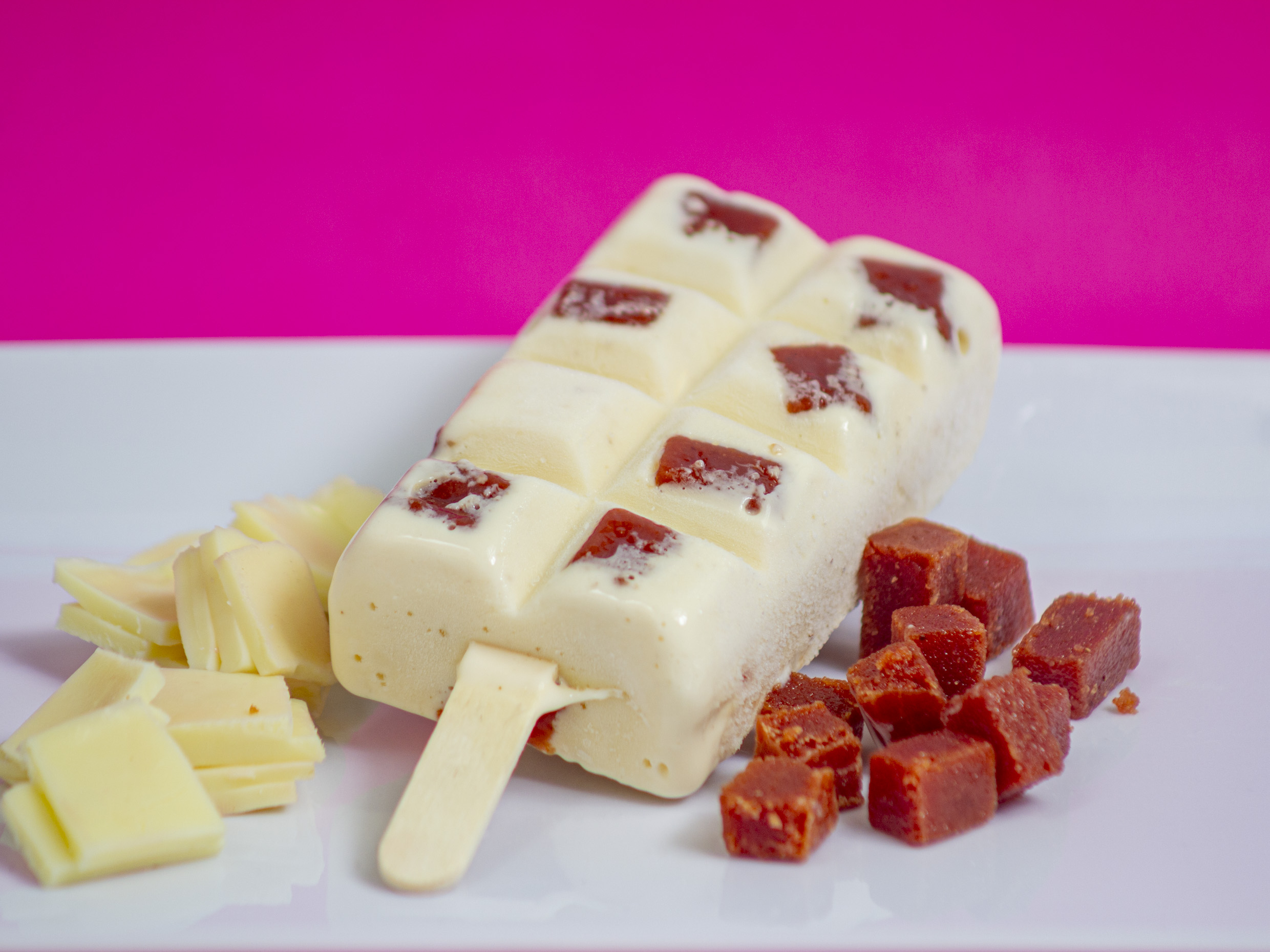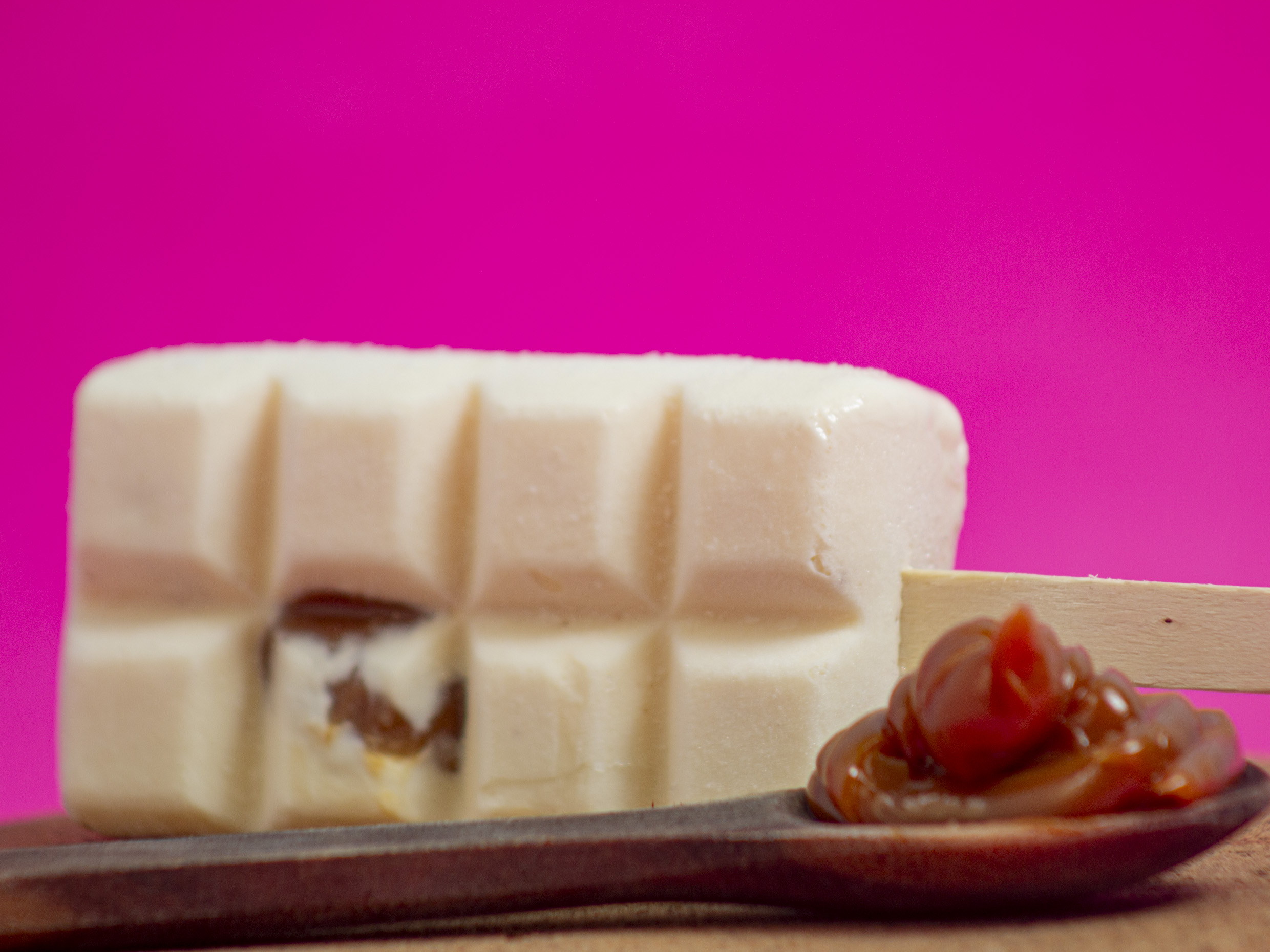 Paleta de oblea, rellena de queso, mora, arequipe y trocitos de oblea.