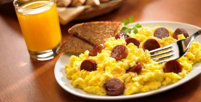 Huevos con Salchicha Ranchera + Maíz, Arepa y Café