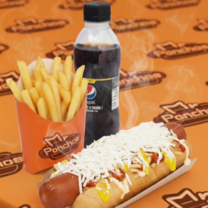 Pan brioche, salchicha americana, papa ripio, salsas, queso rallado, acompañado de papas francesas+ gaseosa 250ml