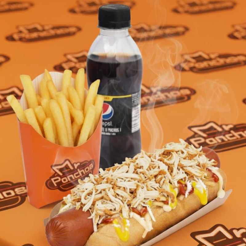 Pan brioche, salchicha americana, papa ripio, pollo desmechado, salsas, queso rallado, acompañado de papas francesas+gaseosa 250ml
