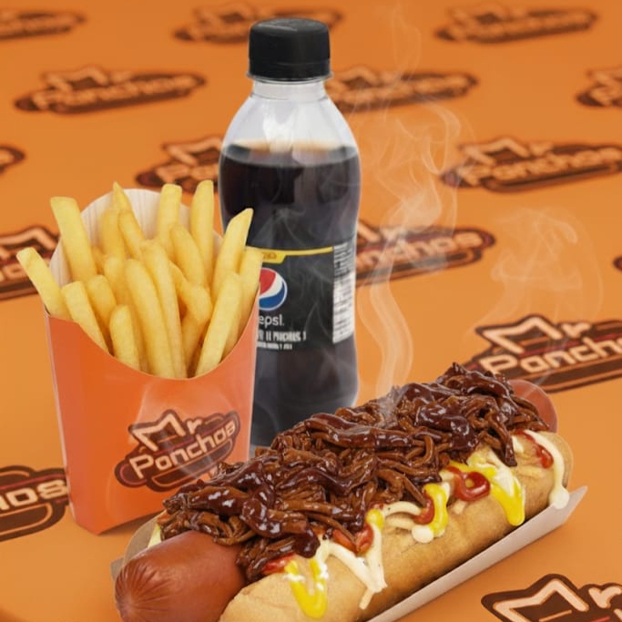 Pan brioche, salchicha americana, papa ripio, carne desmechada, salsas, acompañado de papas francesas+ gaseosa 250ml