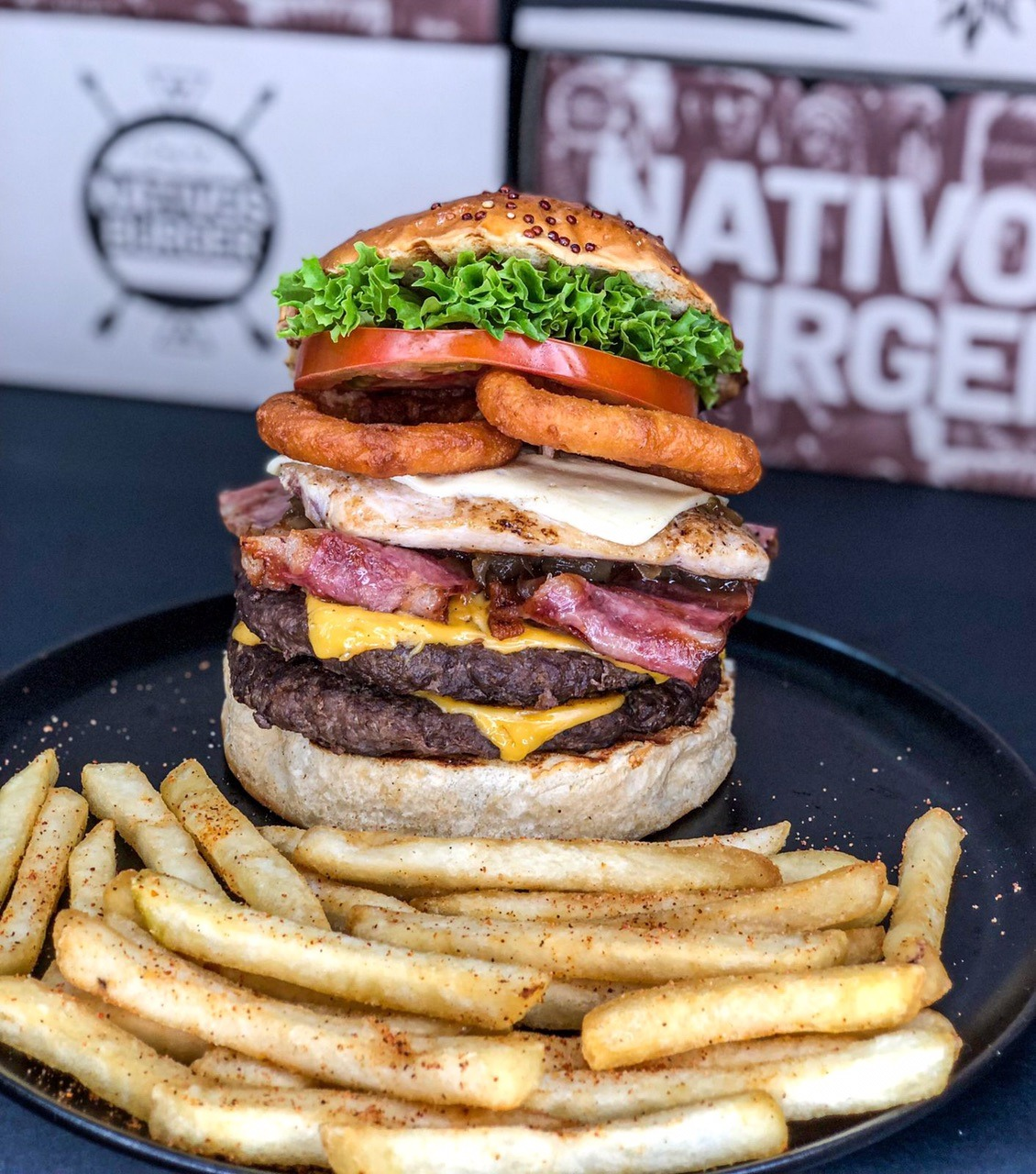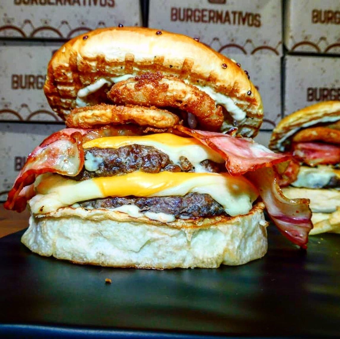 Pan bríos, doble carne de res, doble queso mozzarella, doble queso cheddar, doble tocineta ahumada y aros de cebolla apanados.