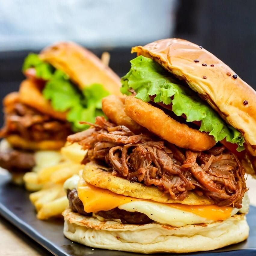 Pan brioche, jugosa carne de res, carne de cerdo desmechado en salsa BBQ, queso mozzarella, queso cheddar, arepa de maíz, aros de cebolla apanados, tomate y lechuga.