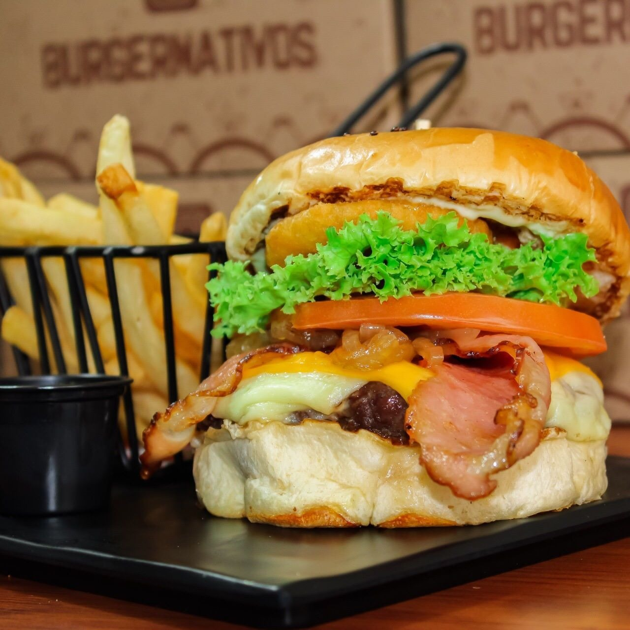 pan brioche, lechuga, tomate, jugosa carne de res, queso mozarella, pepinillos agridulces, tocineta ahumada, aro de cebolla, jeringa con salsa de queso cheddar, + papas a la francesa