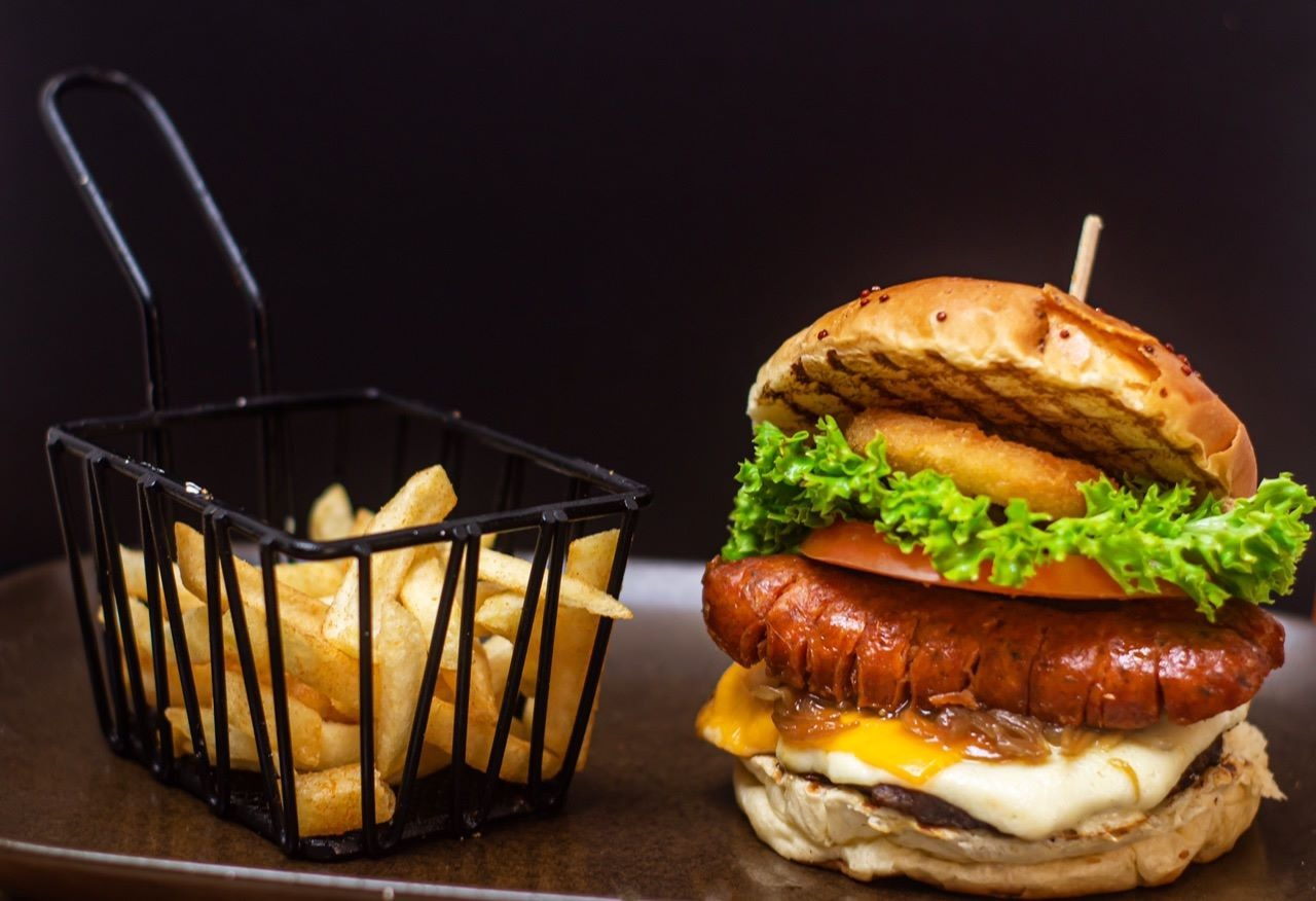 Pan brioche, jugosa carne de res, queso mozzarella, queso cheddar, chorizo de cerdo ahumado, cebolla caramelizada, lechuga, tomate y aros de cebolla apanados.
