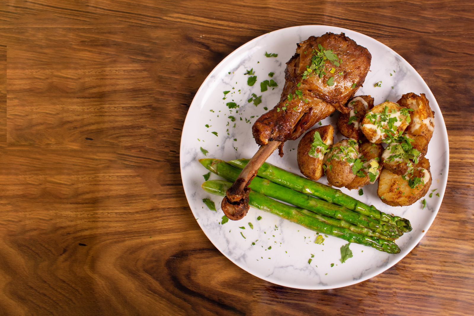 No tienes que esperar hasta diciembre por saborear un pavo, tenemos las mejores piernas de pavo al horno de la ciudad, con papas al horno y Esparrago.