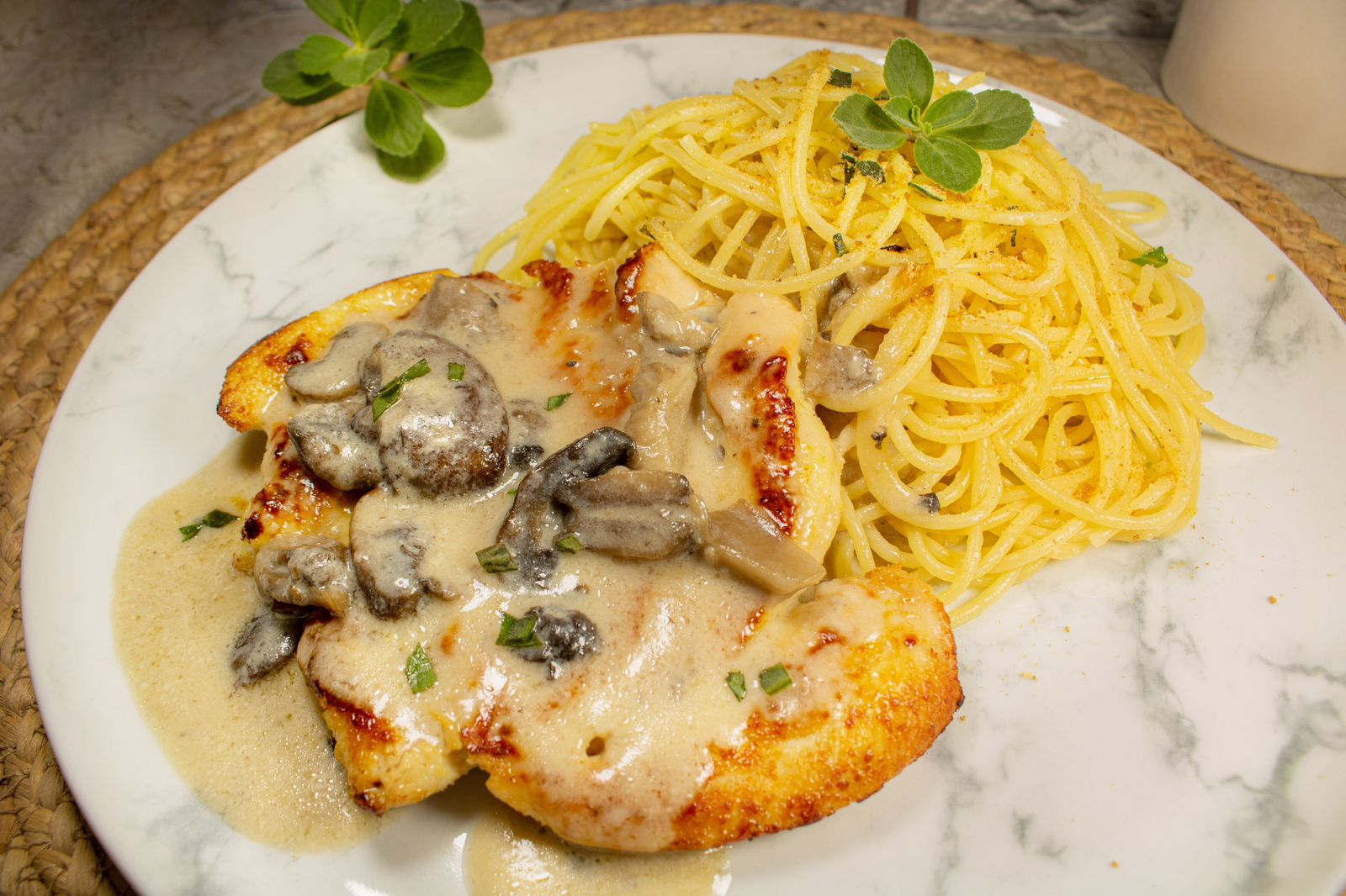Pechuga a la Plancha con Salsa Cremosa de Champiñones, Espagueti alioli (aceite de oliva y perejil) y ensalada del dia.