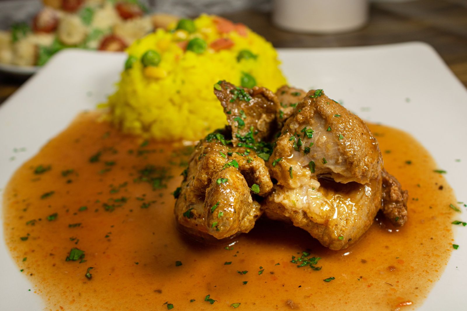 200g de Pierna de cerdo cocinado a fuego lento, receta ancestral mexicana, con arroz español y ensalada del día.