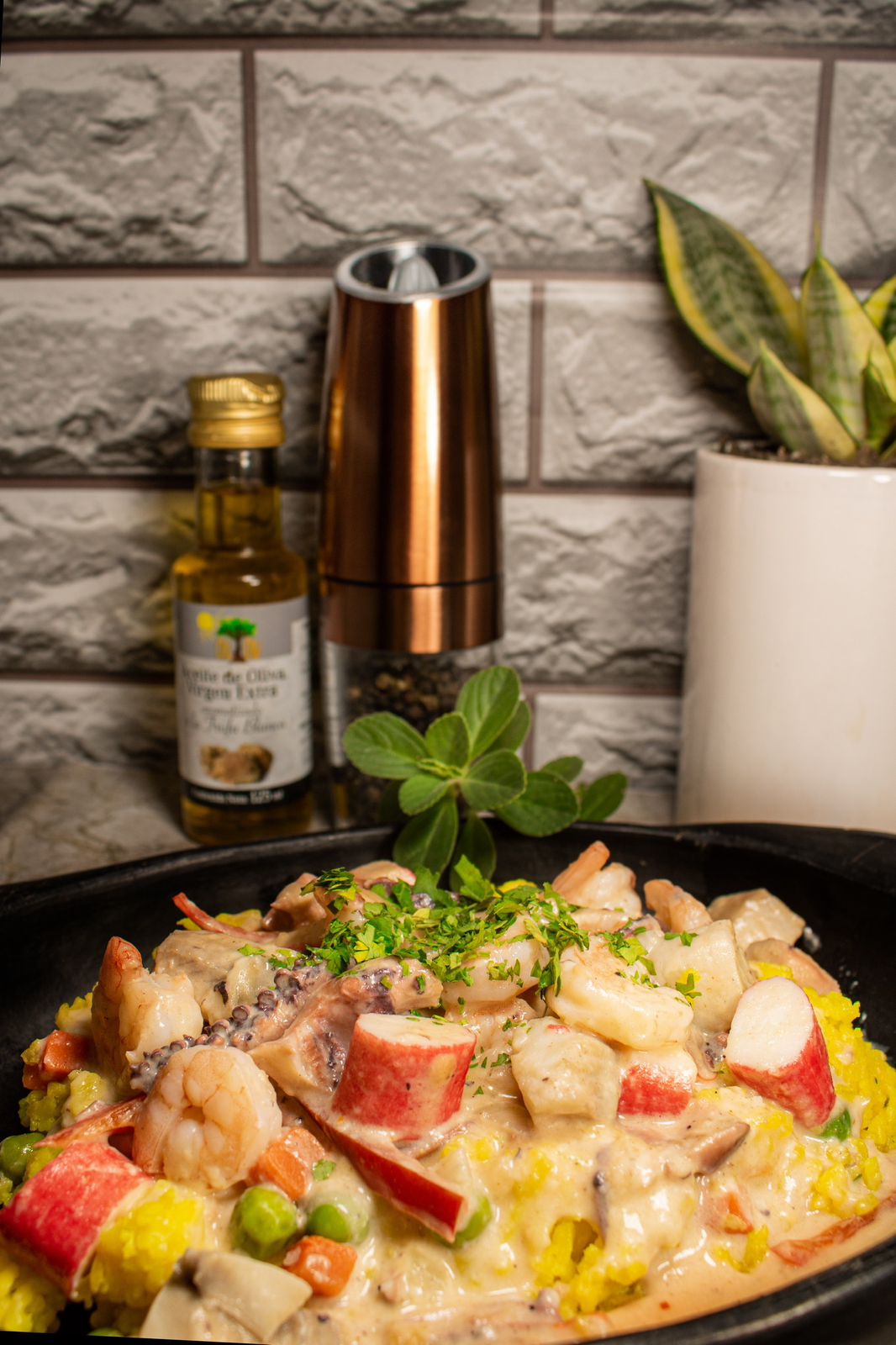 Nuestros delicioso Arroz Español, cubierto con Camarones , Palmitos de Cangrejo y cubos de tilapia, algo de vegetales, en una salsa cremosa con mucho sabor y cariño.