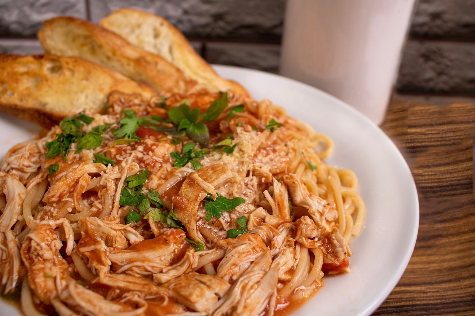 Espagueti con 200g pollo y albahaca con salsa de tomate, con pan baguette.