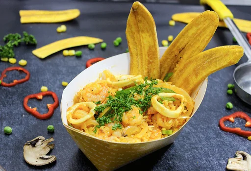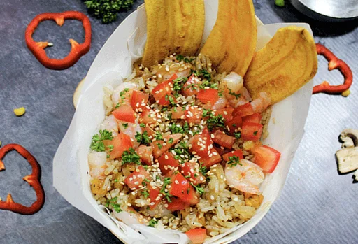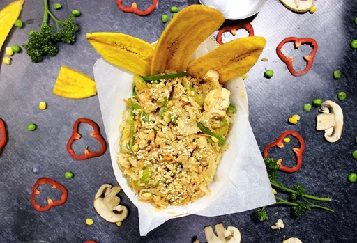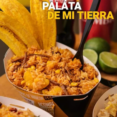PALATA del día + bebida: Deliciosa porción personal de arroz con vegetales y proteinas al WOK + Chips de plátano y tu bebida. Ideal para el desayuno o almuerzo