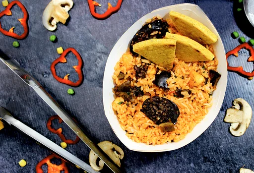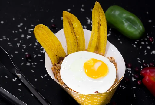 Arroz con carne de lomo de res, tomate, chorizo criollo, huevo en tortilla, cebolla, cilantro, salsa de tomate, maduro, salsa negra (tamaño a elección).