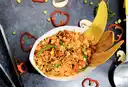 Arroz con maíz, papa criolla, carne desmechada, madurito, salteado en salsa criolla (tipo hogao), tamaño a elección.