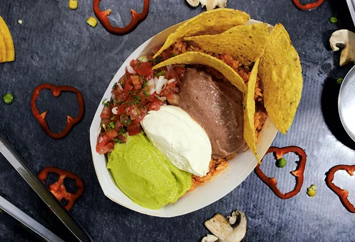 Palata arroz, carne desmechada, frijol refrito, guacamole, pico gallo, sour cream (tamaño a elección).
