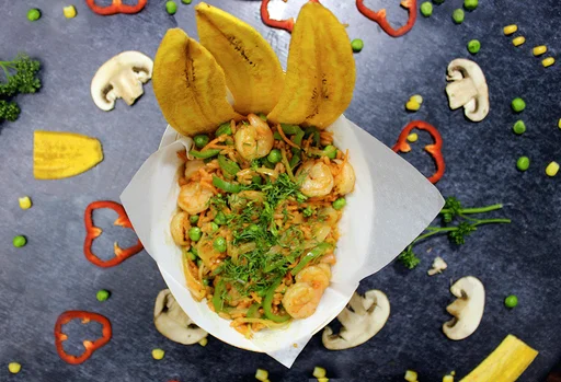 Palata camarones, madurito, tomate, cebolla caramelizada, ajonjolí, perejil, salsa soya (tamaño a elección).