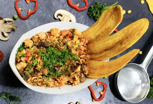 PALATA del día + bebida: Deliciosa porción personal de arroz con vegetales y proteinas al WOK + Chips de plátano y tu bebida. Ideal para el desayuno o almuerzo