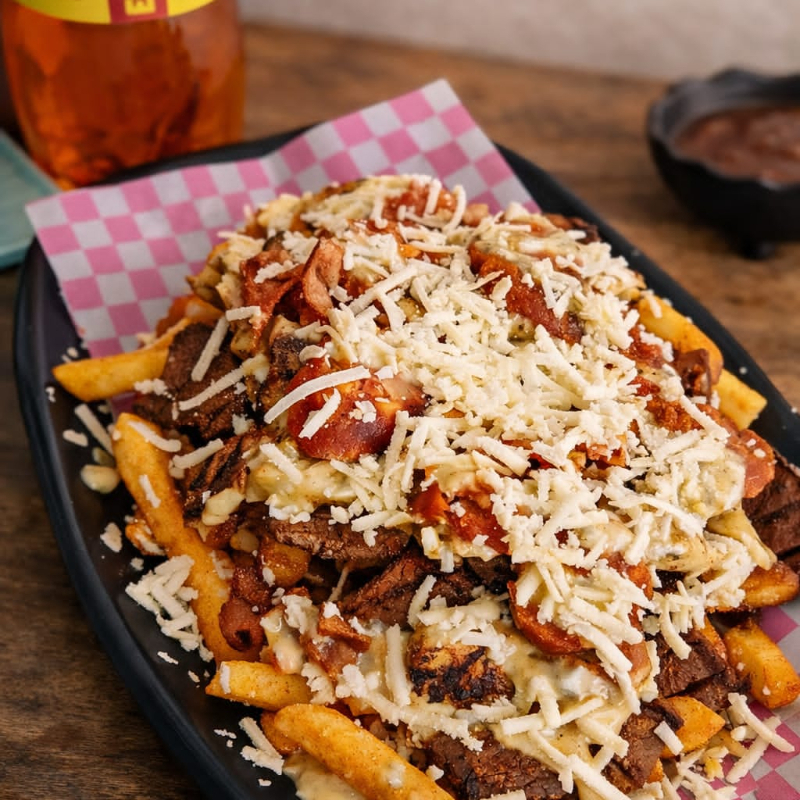 Versión para compartir entre dos personas de nuestras famosas papas con tres carnes al barril y queso.