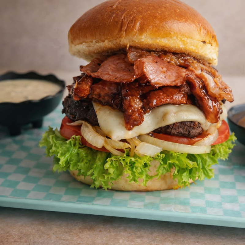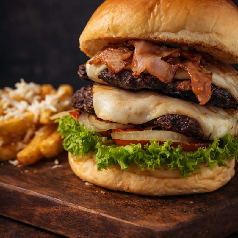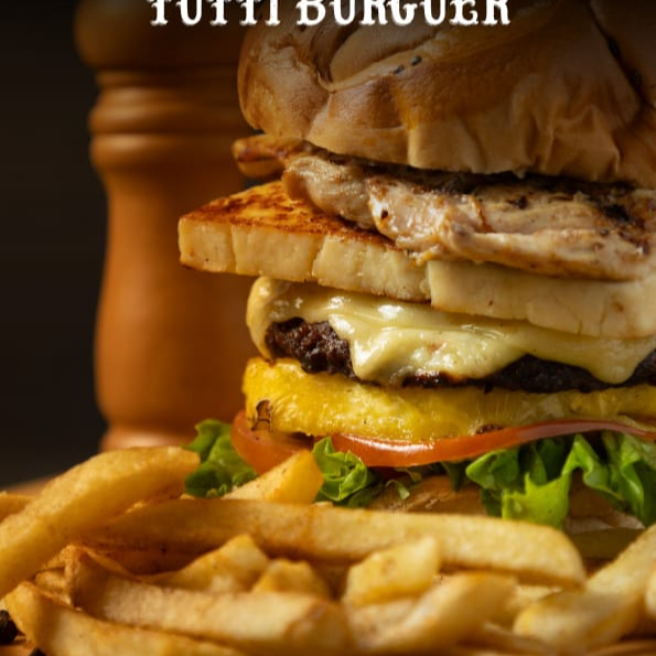 Doble carne de res al carbón (160 g cada una), doble queso cheddar, tocineta crujiente, vegetales, piña, tártara y papas a la francesa.