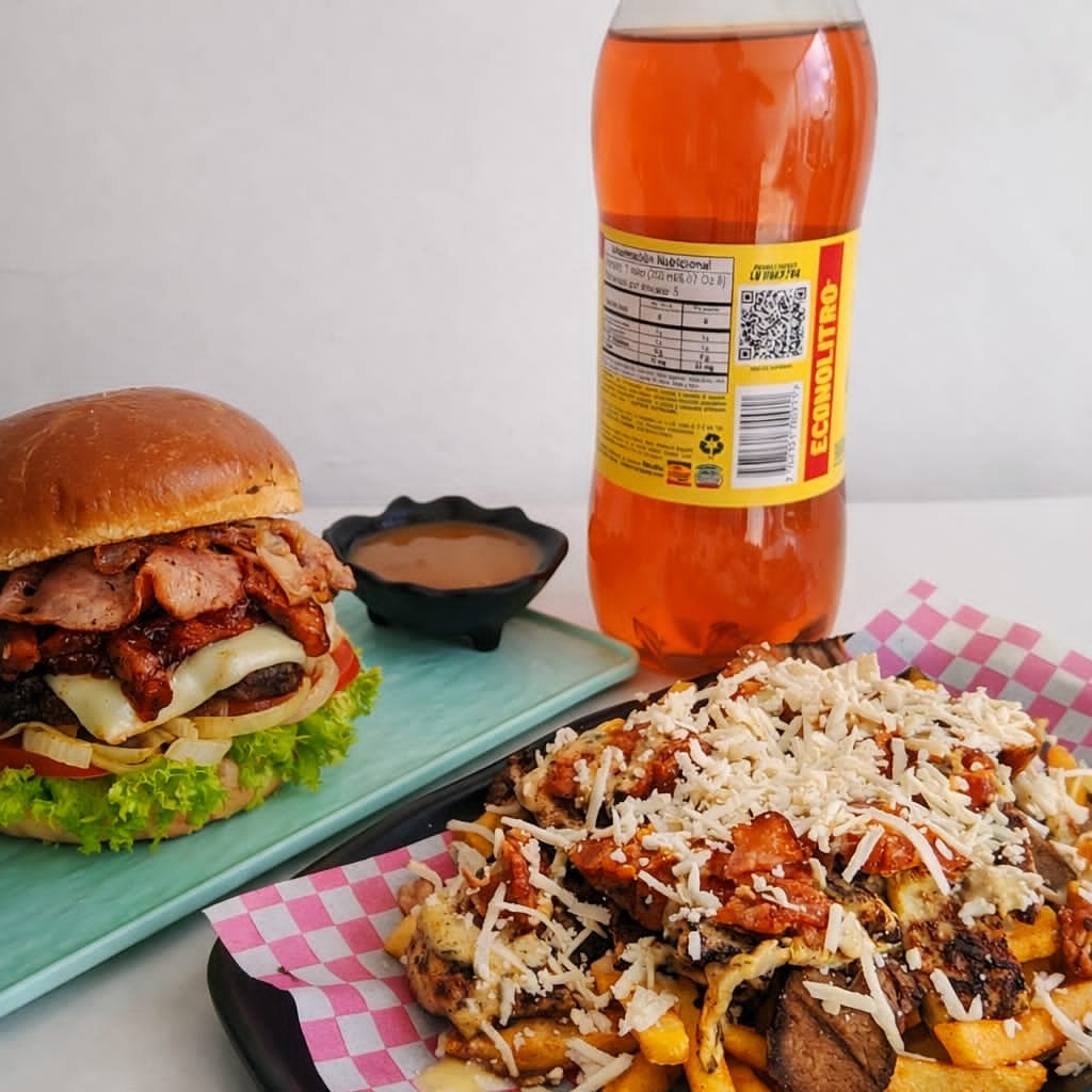El combo definitivo, hamburguesa la puerca, una porción de papas locas al barril y una gaseosa Colombiana de 1 L para disfrutar.